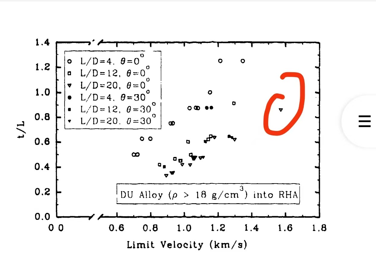 图中圈起来的点为长径比20、着靶速度1.6千米每秒时的贫铀杆状弹,而相对侵彻深度约为0.85。贫铀弹的相对侵彻深度在几乎所有长径比和速度下都要高于钨合金弹药,因此DTC-10的相对侵彻深度不超过0.85。DTC-10的主穿杆的要求为整个飞行体小于等于680mm,因此即便是按照最高680mm的水平(实际穿甲体小于680mm,约为620mm),2000米距离可穿透最大深度为680*0.85=578mm。由于其尾部有高强度的碳化钨,整体强度高于穿杆使用的钨合金,所以穿甲深度应增加40-50mm,即618-628mm。